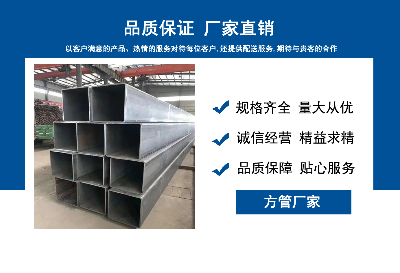 山東方管廠主要生產(chǎn)Q355B方管,Q355C方管,Q355D方管,Q355E方管,低合金方管等,曾多次為客戶解決了各種無(wú)縫管疑難問(wèn)題,經(jīng)不斷的創(chuàng)新與努力,得到了客戶良好的信譽(yù)和稱贊?! 」颈匈|(zhì)量、服務(wù)是我們尋求發(fā)展的唯一途徑,為客戶提供極具市場(chǎng)競(jìng)爭(zhēng)力的高品質(zhì)產(chǎn)品,愿與客戶一起進(jìn)步、共享成功! 我公司秉承“誠(chéng)信經(jīng)營(yíng),服務(wù)周到”的經(jīng)營(yíng)原則,全力以赴,給客戶周到滿意的服務(wù)?!罢\(chéng)信、專業(yè)、認(rèn)真、服務(wù)”是我們的宗旨。幾年來(lái)我們用專業(yè)的技術(shù)和周到的服務(wù)贏得了廣大客戶和供應(yīng)商的信賴,與各大企業(yè)有著廣泛的合作和聯(lián)系,受到了業(yè)內(nèi)好評(píng)。我們會(huì)以優(yōu)良的產(chǎn)品、優(yōu)惠的價(jià)格、優(yōu)先的貨期、優(yōu)良的服務(wù),珍惜客戶給予我們的每一個(gè)機(jī)會(huì)。...